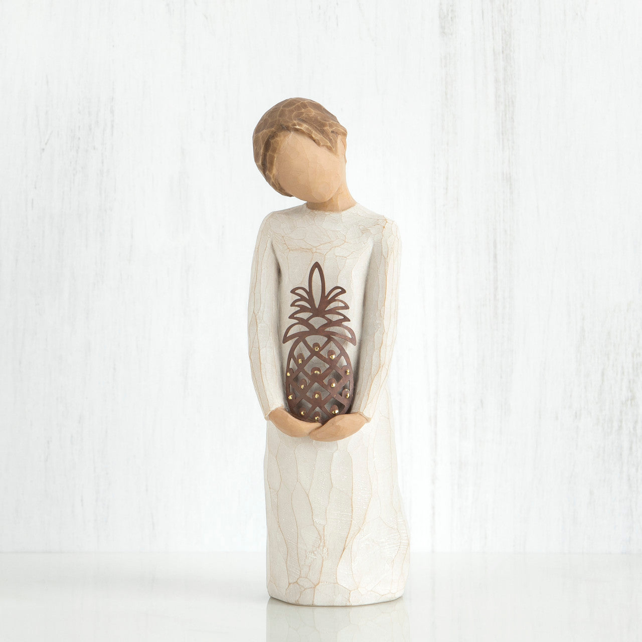 - Standing figure in cream dress, holding rust-colored, pierced-metal pineapple, decorated with gold-leaf dots