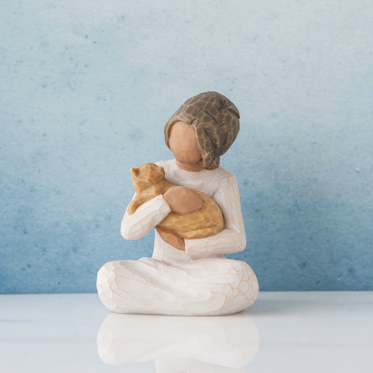 - Figure of seated girl with darker skin tone and hair color, in cream dress, holding yellow cat in her arms