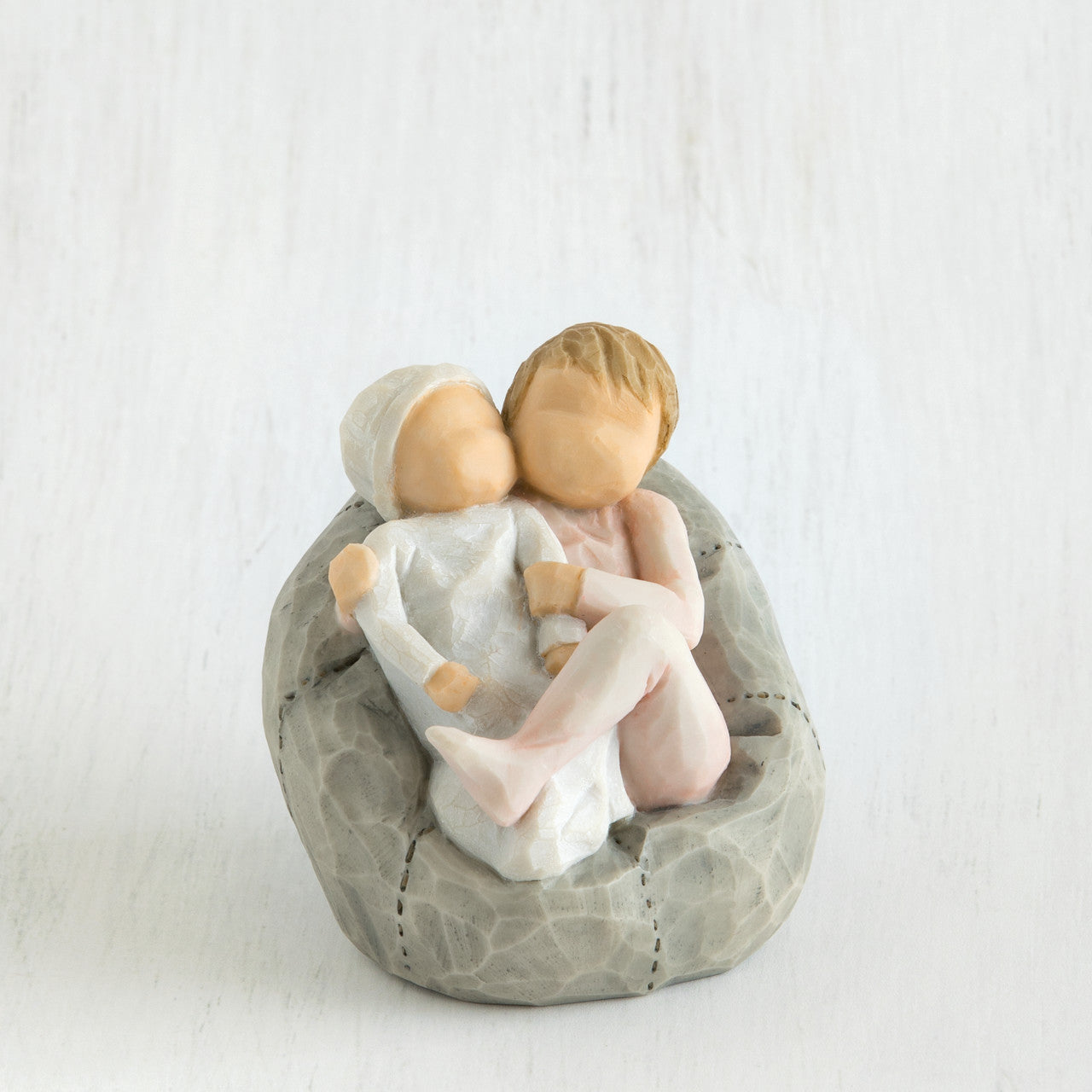 - Figure of toddler holding infant, cuddled together in a beanbag. Toddler wearing blush pink onesie; baby wrapped in cream-color blanket with cream hat